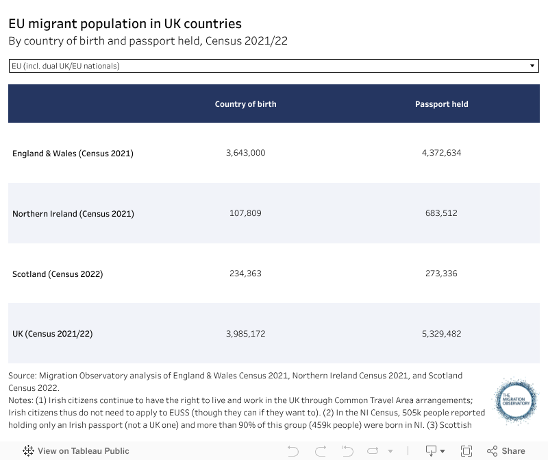 Totals also include almost 460,000 Northern Ireland residents who were born in Northern Ireland and do not hold UK passports. Citizenship is more complex in Northern Ireland, because people born there usually have the right to hold either or both Irish and British citizenship. This means that most people holding EU passports in Northern Ireland were born there and never migrated from an EU country.