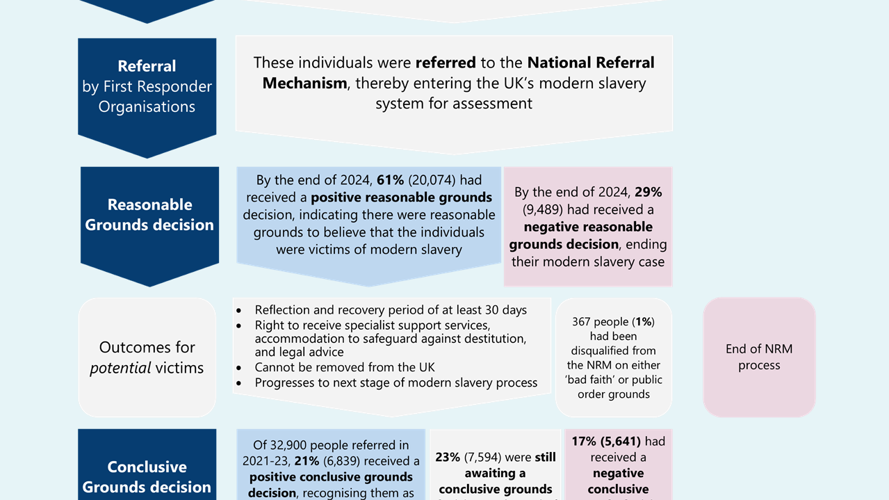 More… - Since at least 2017, the majority of non-UK nationals in the NRM also claimed asylum, but most asylum claimants are not referred to the NRM. Around one in ten people arriving by small boat from 2018 to 2024 were referred to the NRM. The number of people receiving asylum as a result of being a victim of modern slavery is not published, but available data suggest it was substantially less than 8% of those granted refugee status through the asylum system between 2021 and 2024.